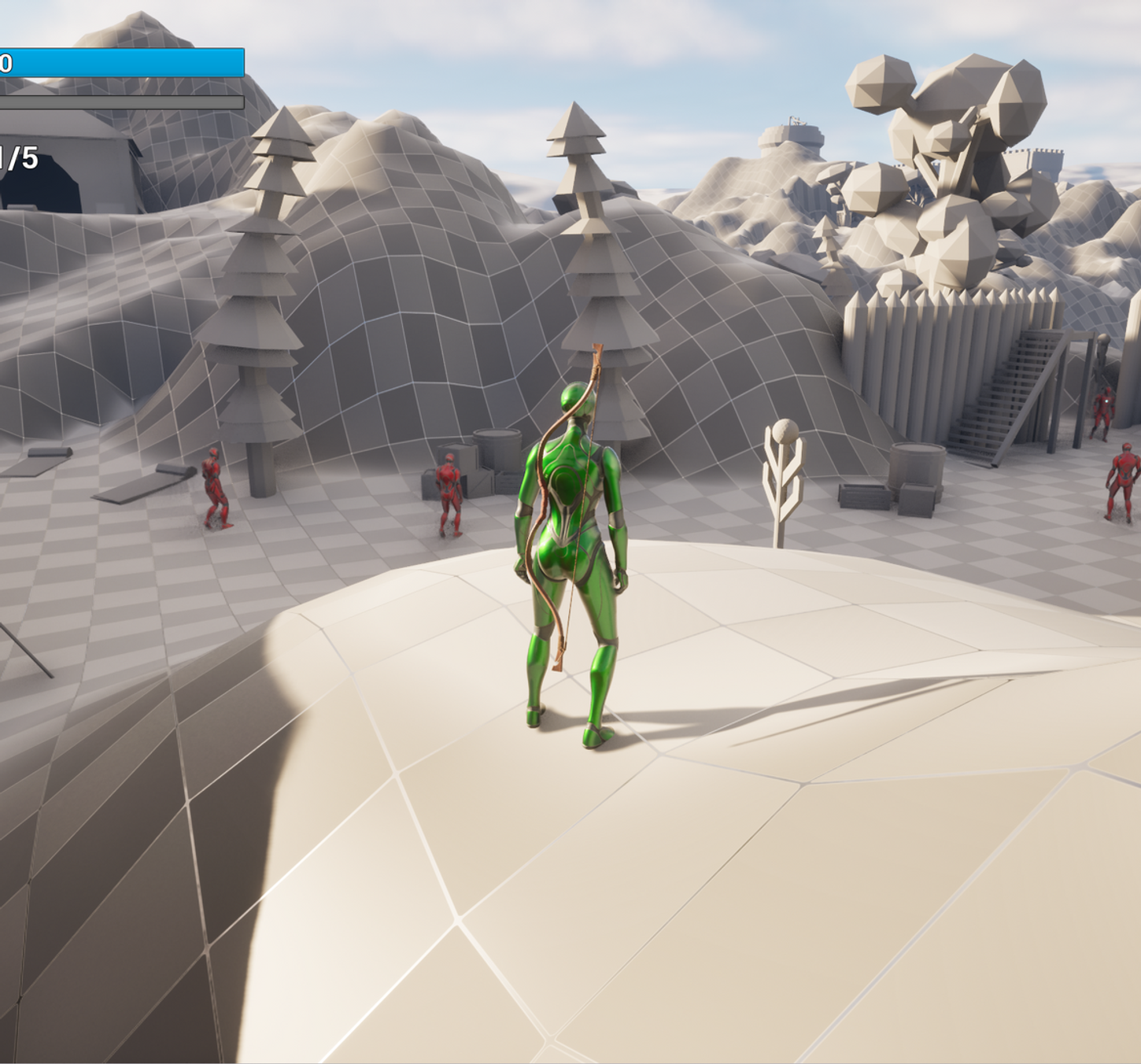 The player's previous bow and arrow system needed a lot of work, so when I first started working on my combat system I went and completely redesigned this system first. I created a new animation blueprint and used different animations that included strafing with the bow, as well as draw, hold and fire animations. I also changed how the arrow is spawned and fired, allowing the player to hold the arrow longer which would change the velocity and trajectory of the arrow when the fire button was released. This change made we also change the crosshair to function more dynamically, so it would change and give a little "flare" indicating that the arrow had been fully drawn to it's maximum.
